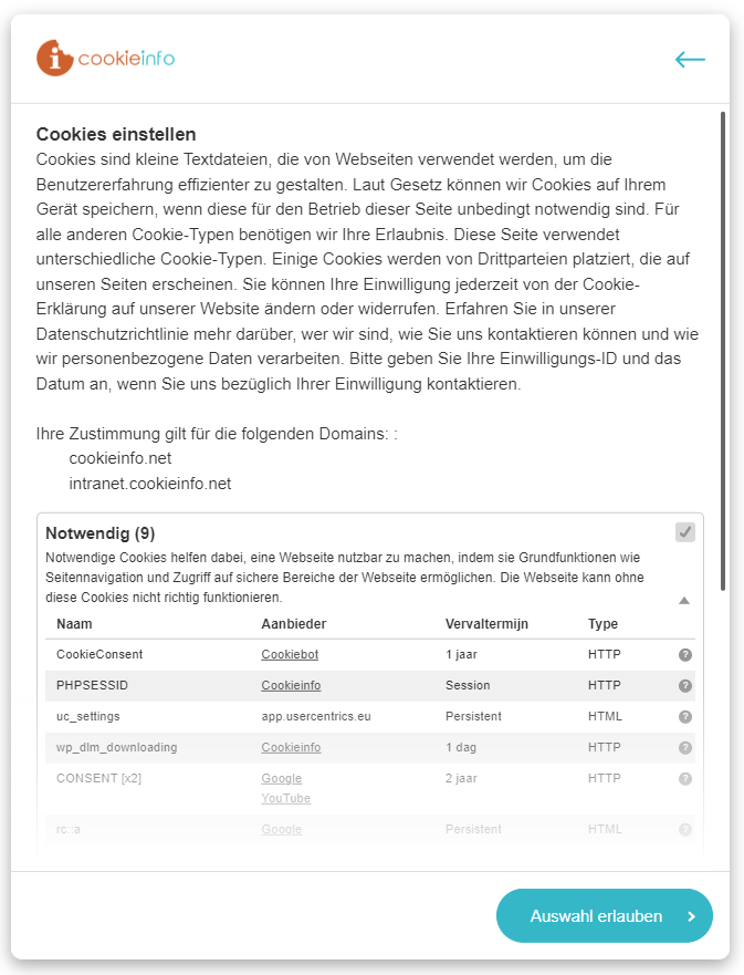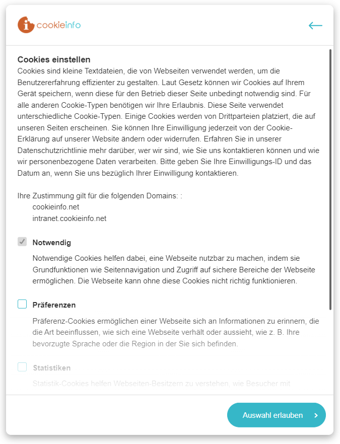 * Wenn Sie sich über CookieInfo bei Cookiebot anmelden, werden Ihr Vertrag und Ihre Rechnungen direkt von Cookiebot abgewickelt. CookieInfo ist als Ihr Servicepartner verbunden, wodurch wir Ihnen First-Line-Support und maßgeschneiderte Cookie-Banner bieten können ohne zusätzliche Kosten.