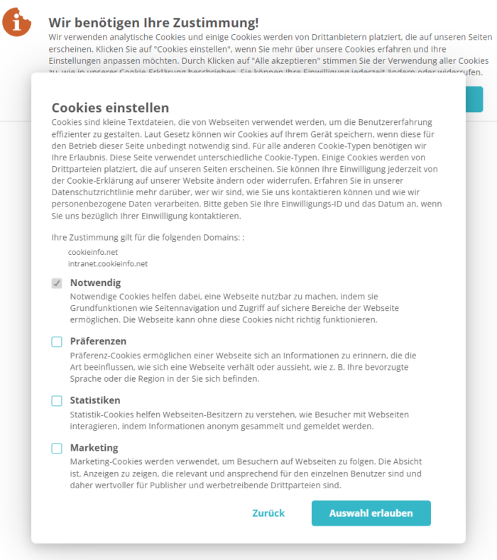 - Die Cookie Banner Template Designs können nur verwendet werden, solange CookieInfo Ihr ausgewiesener Partner in Ihrem Cookiebot-Konto ist.