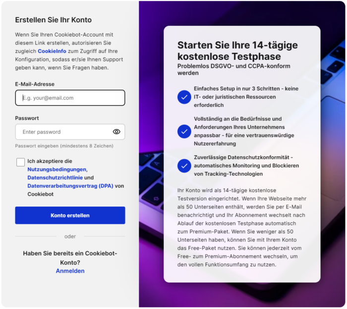 - Fordern Sie auf der Preisseite von CookieInfo oder hier ein Testkonto an.