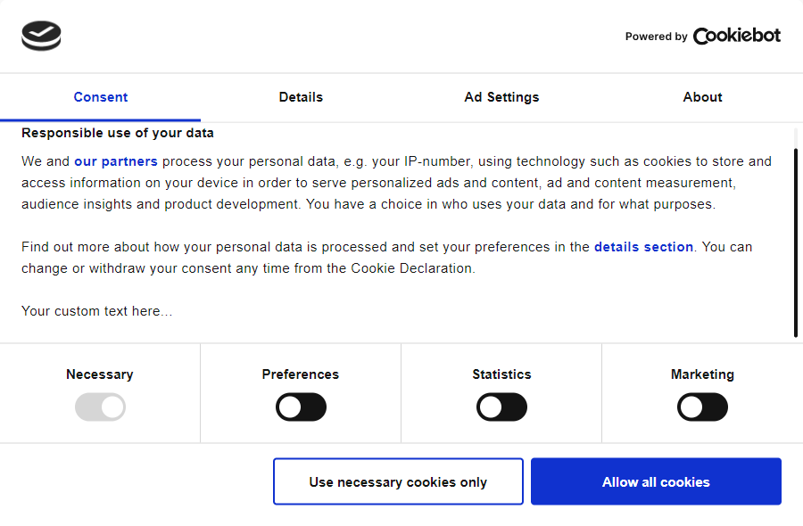 Laatst bijgewerkt opMarch 13, 2024This article describes requirements and potential differences in the Cookiebot consent banner configured in your account and the version shown on your website. If you are looking for instructions on how to setup and implement the Cookiebot consent banner with the IAB TCF v2.2 integration enabled, please see our article on this subject here.Any mentioning of compliance in this article strictly relates to compliance with IAB policies and should not be mistaken for GDPR compliance.When using Cookiebot with the IAB TCF v2.2 integration framework enabled, a number of IAB compliance policy rules are enforced on the banner that will be shown to your visitors.This can result in a difference in the appearance of the consent banner configured in your Cookiebot account and the consent banner shown to visitors on your website.1. Required banner textBelow screenshot shows the mandatory text content that must be shown on banners with IAB TCF integration enabled. This text is automatically inserted into the banner and cannot be altered.The middle section describing collection of geo-location data and fingerprinting is shown dynamically if IAB “Special Features” is enabled. This is enabled in the banner by default. To disable special features please follow instructions found here.With “Special Features” disabled the default text in the banner will be shown like this:The mandatory text will be added in the same language as the language defined for the banner, if this is one of the 29 other languages supported by the IAB framework (With the exception of Serbian in Cyrillic). If a different language is used in the banner, the text will be inserted in English. 2. Required opt-out buttonYour banner must present an option to opt out for the user. This option is currently available on the following banner types:[Accept / Decline][Multilevel] with the button option [ Allow all/selection ] (Example shown above)[Multilevel] with the button option [ Reject All / Selection / Allow All ]If your banner configuration is not compliant with the opt-out button requirement, our solution will automatically overwrite the banner output shown to the visitor to comply with the IAB TCF v2.0 policies. This means that we will show the banner type [Multilevel] with the button option [Allow all/selection] on your website. This is the banner type displayed in the screen shot above.If the non-compliant banner type configuration chosen in your account makes use of pre-ticked checkboxes, the automatic overwrite will preserve your choice with regards to the pre-selected categories.If the non-compliant banner type configuration chosen in your account does not contain checkboxes, the automatic overwrite will show empty checkboxes for the three selectable categories in accordance with GDPR requirements.3. Custom text optionIf you’d like you may add your own custom text below the mandatory text content in the consent banner.You can do so by adding text in the “Dialog body text” field under “Content” in “Settings” on your Cookiebot account.Any text you define here will be added below the mandatory text as shown below.We recommend that you use this option to add text to make it clear to your website users where they can find the Cookie Declaration in order to change or withdraw their consent. You can add a link to your Cookie Declaration, see how in this article. You may also add any additional information that you would like to display to your website users e.g. around your identity as a data controller as well as any links you would like to add e.g to your Privacy Policy.If you wish you may also edit the text on any of the buttons shown on the consent banner. To do so you must choose one of the three banner configurations mentioned in section 2 of this article. You will then be able to change the text in the “Content” pane.4. Why is this necessary, what if I don’t want this in my banner?As an IAB Consent Management Platform (CMP) we are required to ensure compliance with the IAB TCF v2.0 policies on usage and implementation across all our customers’ banners.In the words of the IAB:“Non-compliant CMP implementations undermine the reputation of the TCF and expose participating organisations to serious legal risks. As the only visible point of contact with the user and authorities, CMPs have a responsibility and obligation under TCF policies to ensure that the market implements compliant versions of the UI.” ( IAB TCF v2.2 policies)Failure to comply with the IAB policies has severe consequences as this will result in expulsion of the CMP as an IAB TCF v2.2 CMP.The IAB is continuously assessing all CMP solutions and checking them for policy compliance. Our solution passed IAB verification and certification for TCF on all technical aspects in April 2020. However, IAB since then found that the wording of the banner content in some cases did not meet the requirements of the IAB compliance policy. This happened despite our best efforts to guide our customers and therefore we were forced to take the above measures to force compliance on our IAB integration solutions. We do this in order to ensure that we can keep this integration running for all of our customers requiring it. The measures will be implemented on 13 August 2020.AlternativesYou can operate your website with ads without making use of the IAB framework with Cookiebot. The Cookiebot consent solution allows you to integrate ad solutions the exact same way you do today, without the IAB framework integration activated. The Cookiebot solution will run scripts and ad integrations as the submitted consent allows, making sure ad vendors get activated as intended. The only difference will be that the adTech vendors will not receive a signal through the TCF but can instead assume that full consent has been given when their tag is loaded and active on the website. This does not stop any vendor from serving the right ads in the case