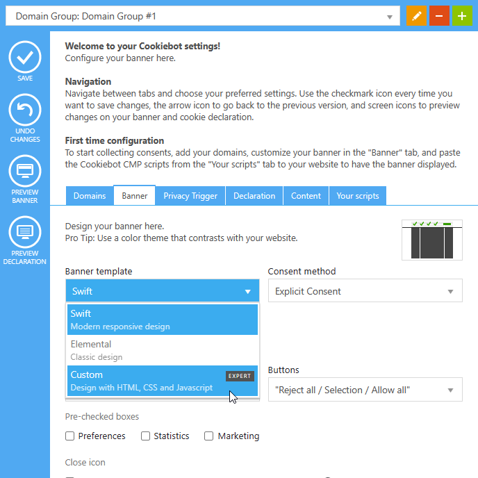 Informatie & support > Kennisbank - Helpdesk > Aanpassen stijl cookie banner >Laatst bijgewerkt opoktober 1, 2024Een paar jaar geleden introduceerde Cookiebot de Swift-banner, die de oorspronkelijke Elemental-banner verving.Nieuwere gebruikers hebben al niet meer de optie om de Elemental-banner te selecteren, en nu is de tijd gekomen om de Elemental-banner helemaal te schrappen.Op 26 november 2024, als je nog steeds de Elemental versie van de Cookiebot banner gebruikt, zal deze automatisch worden bijgewerkt naar het ontwerp van de nieuwere Swift banner.Elementaire bannerSnelle bannerAls je de kleuren, knoppen, lay-out, etc. van je banner hebt aangepast, raden we je sterk aan om voor de deadline handmatig te migreren naar de Swift-banner om er zeker van te zijn dat je aanpassingen behouden blijven.Je kunt dit doen in de Cookiebot manager door de Swift banner te selecteren en de kleuren van de knoppen aan te passen aan je behoeften. Je kunt ook werken met een CookieInfo aangepaste banner.Welke actie moet ik ondernemen?Hoewel de migratie automatisch zal gebeuren, raden wij aan om, als uw banner is aangepast, zo snel mogelijk te migreren naar de Swift-banner met behulp van de nieuwe Cookiebot CMP Admin Interface.De Swift-toestemmingsbanner biedt:-verbeterde gebruikerservaring out of the box-uitgebreid aanpasbaar-volledig responsief ontwerp geoptimaliseerd voor mobiel gebruik-verbeterd gebruiksgemak en toegankelijkheid voor alle gebruikers-transparante toestemming van de gebruiker met opt-in/opt-out togglesWat gebeurt er als ik geen aanpassingen doe?Als je niet handmatig migreert naar de Swift banner voor 26 november 2024, wordt je banner automatisch gewisseld. Aanpassingen die u hebt gemaakt aan de Elemental banner worden niet overgenomen. Voor hulp bij het maken van een aangepaste banner, verwijzen we je graag naar onze aangepaste banners (beschikbaar om te downloaden in het CookieInfo portaal).Welke instellingen worden toegepast?De standaard witte Swift-banner met de standaardinstellingen wordt toegepast.Previous Facebook Twitter LinkedIn E-mail