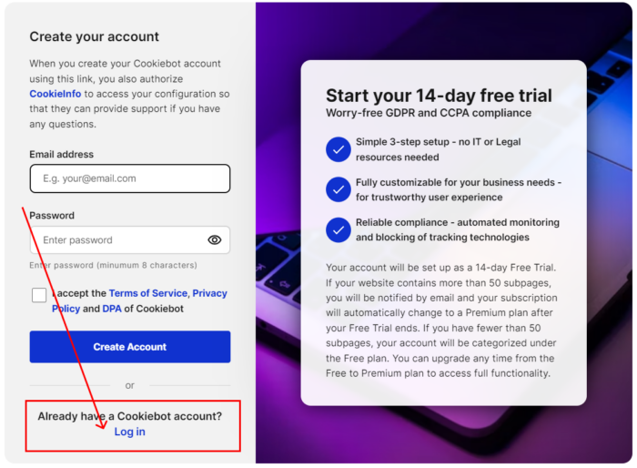 Log vervolgens in met het e-mailadres en wachtwoord van de klassieke “Cookiebot manager”.